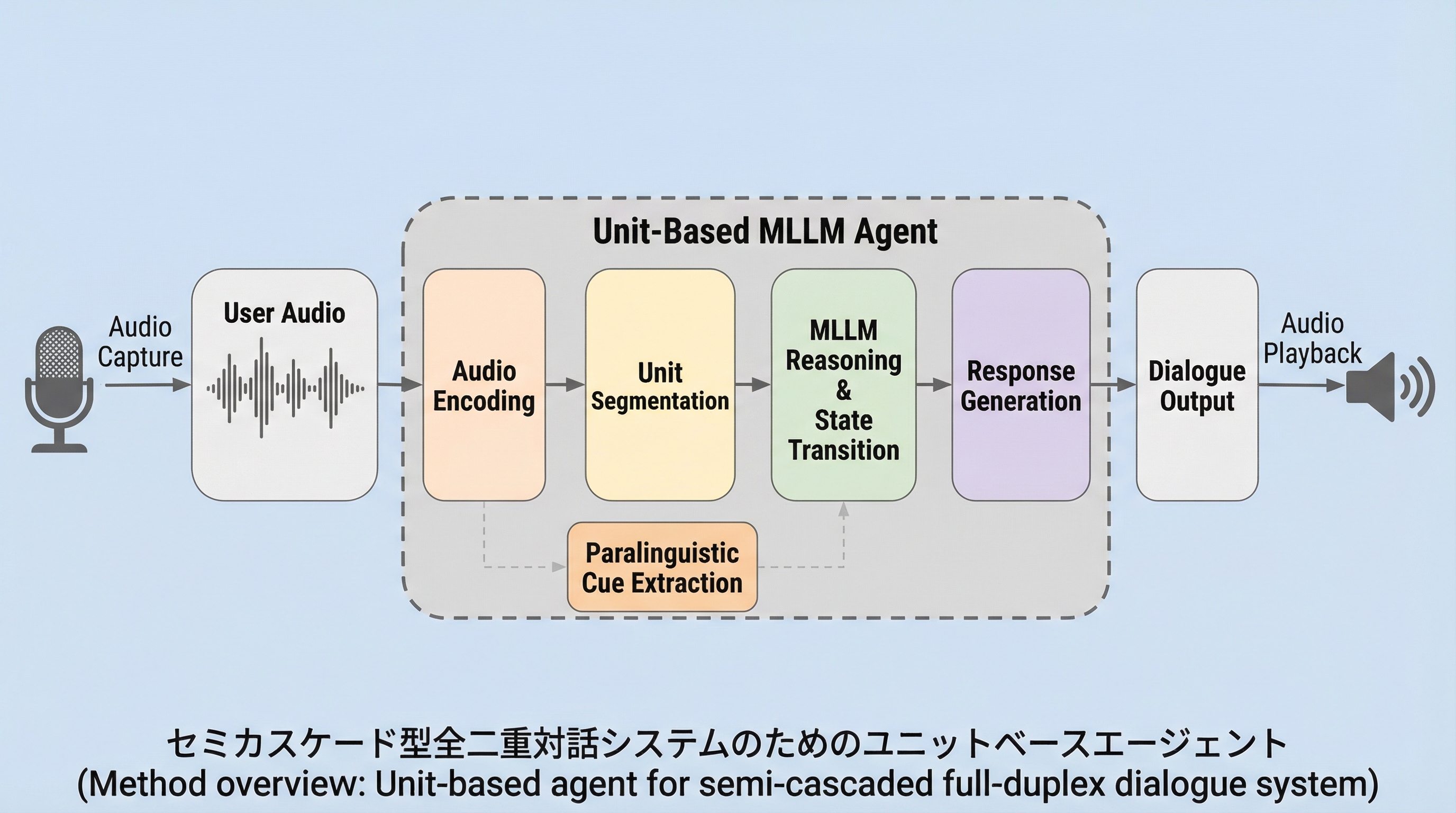複雑な対話を「会話ユニット」という最小単位に分解し、マルチモーダル大規模言語モデル(MLLM)が「継続」か「切り替え」かを判断することで、人間のように自然な全二重音声対話を可能にする新しいフレームワークを提案した。