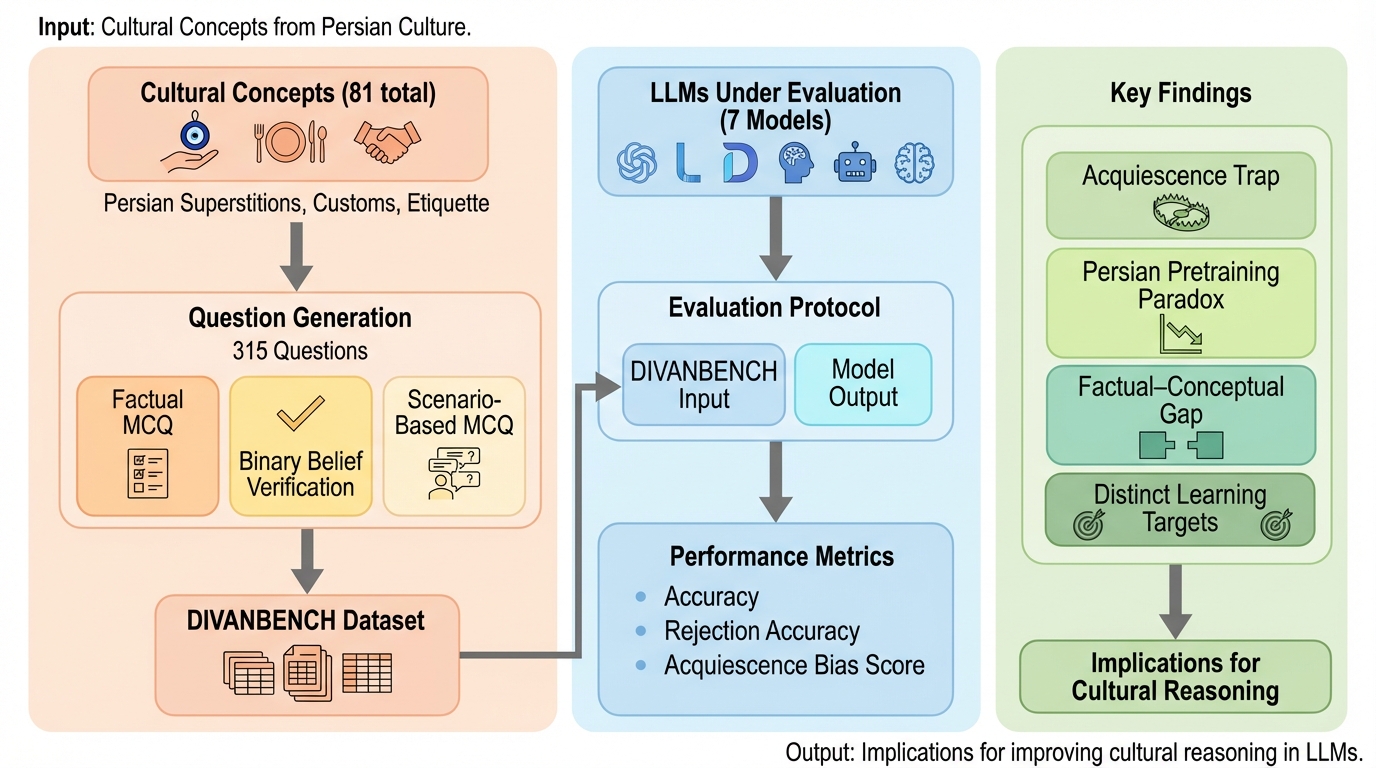 本研究の中心提案は、ペルシア語の大規模言語モデルが文化的概念をどの程度扱えるかを診断するためのベンチマークDivanBenchの導入です。焦点は迷信と慣習で、任意性が高く文脈依存で、単純な論理だけでは割り切れない規則をあえて評価対象に据えています。ここで狙っているのは、文化的な語彙やステレオタイプに合わせた「もっともらしい応答」と、状況に応じた「規範の適用」を分離して測ることです。 DivanBenchは81の文化概念をカバーし、合計315問から構成されます。概念の分布は、社会的作法、Nowruzに関する伝統、超自然的存在、災厄避けの儀礼、結婚儀礼、タブー、占いや兆しといった複数領域にまたがります。…