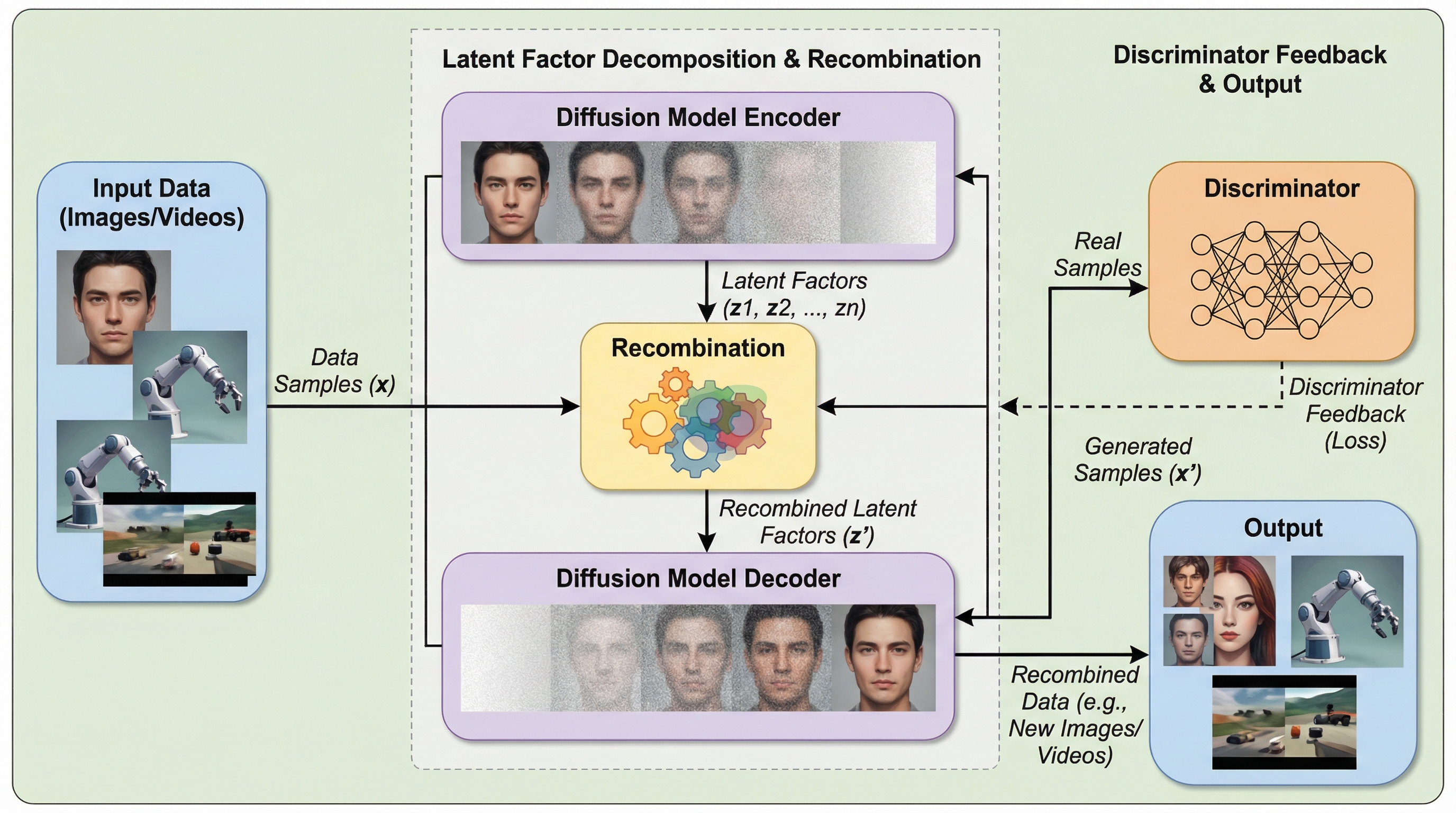 複雑なデータを教師なしで背景、照明、物体の属性、あるいはロボットの動作といった独立した構成要素へと分解し、それらを自在に再結合して新たなサンプルを合成する手法を提案する。本研究では拡散モデルを基盤とし、要素レベルの教師信号を一切必要とせずに、再利用可能な構成要素を抽出する能力を持つ因子化された潜在空間の学習を実現している。 学習過程において、単一のデータ源から生成されたサンプルと、複数のデータ源の構成要素を組み合わせて生成されたサンプルを判別する「識別器」を用いた敵対的学習シグナルを導入した。生成器がこの識別器を欺くように最適化されることで、再結合されたデータにおける物理的および意味的な一貫性が強化され、不自然なアーティファクトの抑制と高品質な合成が可能になる。 CelebA-HQ、Virtual KITTI、CLEVR、Falcor3Dといった画像データセットで、従来手法を上回るFIDスコアと高い解離性を達成した。さらに、ロボットのビデオ軌跡における動作要素の再結合という新しい応用を実証し、LIBEROベンチマークにおいて状態空間の探索範囲を大幅に拡大する多様なシーケンスの生成に成功した。