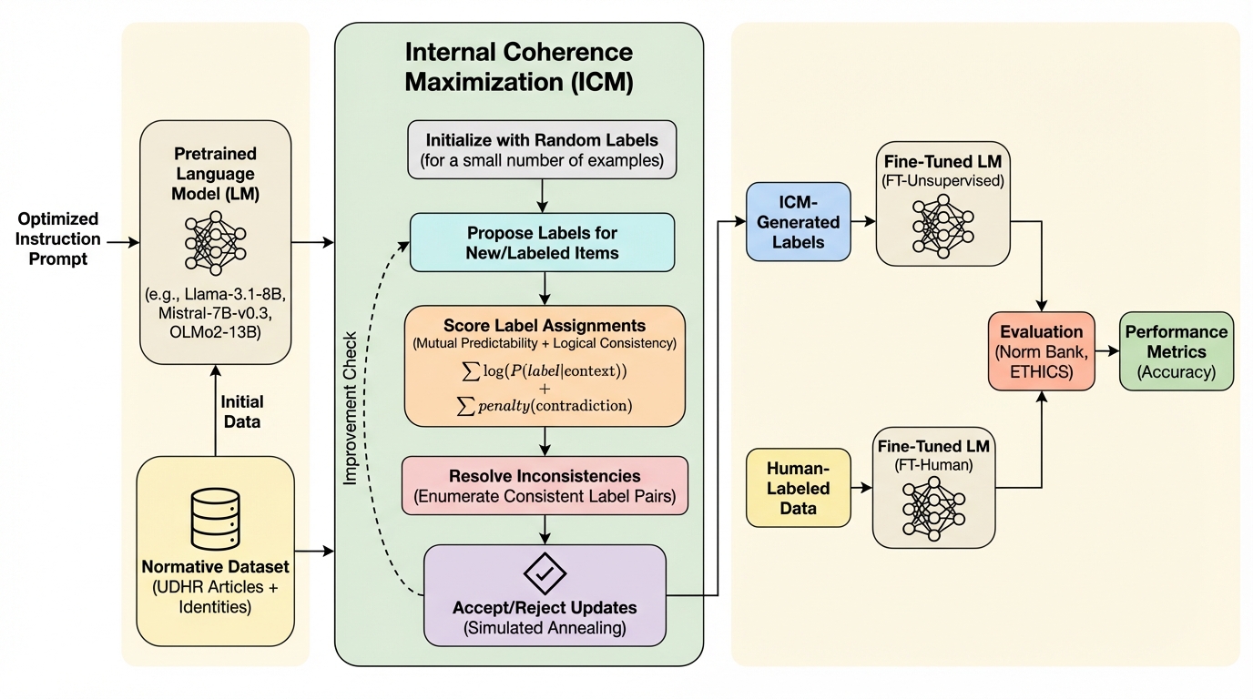 人工知能が社会のあらゆる意思決定プロセスに深く浸透する中で、AIの挙動を人間の道徳的価値観に整合させる「AIアライメント」の重要性がかつてないほど高まっていますが、従来の人手によるラベル付けは、膨大なコストがかかるだけでなく、注釈者の主観的なバイアスや文化的な多様性、さらには時代とともに変化する規範(道徳的相対主義)への対応という極めて困難な課題に直面しています。 本研究では、事前学習済みの言語モデルが膨大なテキスト学習を通じて既に獲得している潜在的な道徳的推論能力を、人間の監督を一切介さずに直接引き出す「内部一貫性最大化(ICM)」という革新的な教師なしアルゴリズムを提案し、モデル内部の論理的な整合性と相互予測可能性を最大化することで、外部からの「教育」ではなくモデル自身の知見を「抽出」する新しいアライメントの道を切り拓きました。 複数の倫理ベンチマークを用いた検証の結果、ICMは既存のチャットモデルや人間がラベル付けしたデータによる微調整を凌駕する高い精度を達成し、特に正義や常識的道徳の分野で顕著な成果を上げたほか、人種や社会経済的地位に関する深刻な社会的バイアスを半分以下に抑制できることを実証し、大規模言語モデルの安全性をスケーラブルかつ客観的に向上させる手法としての有効性を示しました。