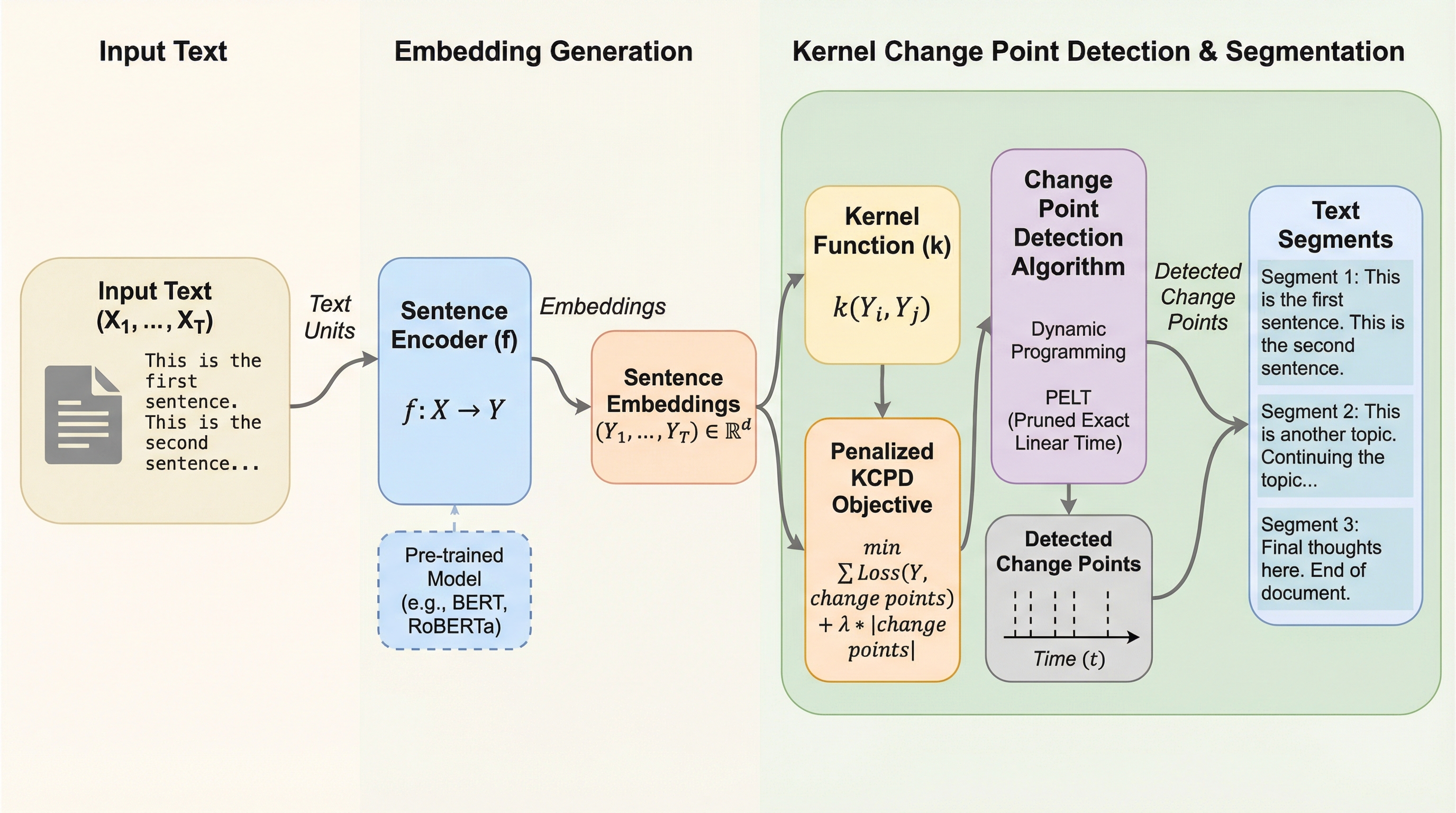 文書を意味的に一貫したトピック単位に分割するテキストセグメンテーションは、情報検索、要約、質問応答、談話分析といった多くの自然言語処理(NLP)システムの基盤となる重要な工程です。しかし、このタスクを教師あり学習で解決しようとすると、いくつかの深刻な問題に直面します。まず、境界ラベルの付与には多大なコストがかかるだけでなく、何をもって「正しい境界」とするかは下流のタスクや求められる粒度、注釈プロトコルによって大きく異なり、主観性を完全に排除することができません。そのため、特定のデータセットで学習したモデルを他のドメインや異なる基準のタスクに転移させることが困難であるという課題があります。このような背景から、ラベルなしで動作し、多様なデータセットに対して頑健な教師なし手法の実用的な価値は極めて高いと言えます。 統計的な視点では、セグメンテーションはデータの生成分布が変化する指標を特定する「変化点検出(CPD)」として捉えることができます。従来の変化点検出手法は強力な理論的保証を持ちますが、ガウス分布や独立性、等分散性といった制約の強い仮定に依存していることが多く、高次元のテキスト表現に対しては脆弱になる可能性があります。…