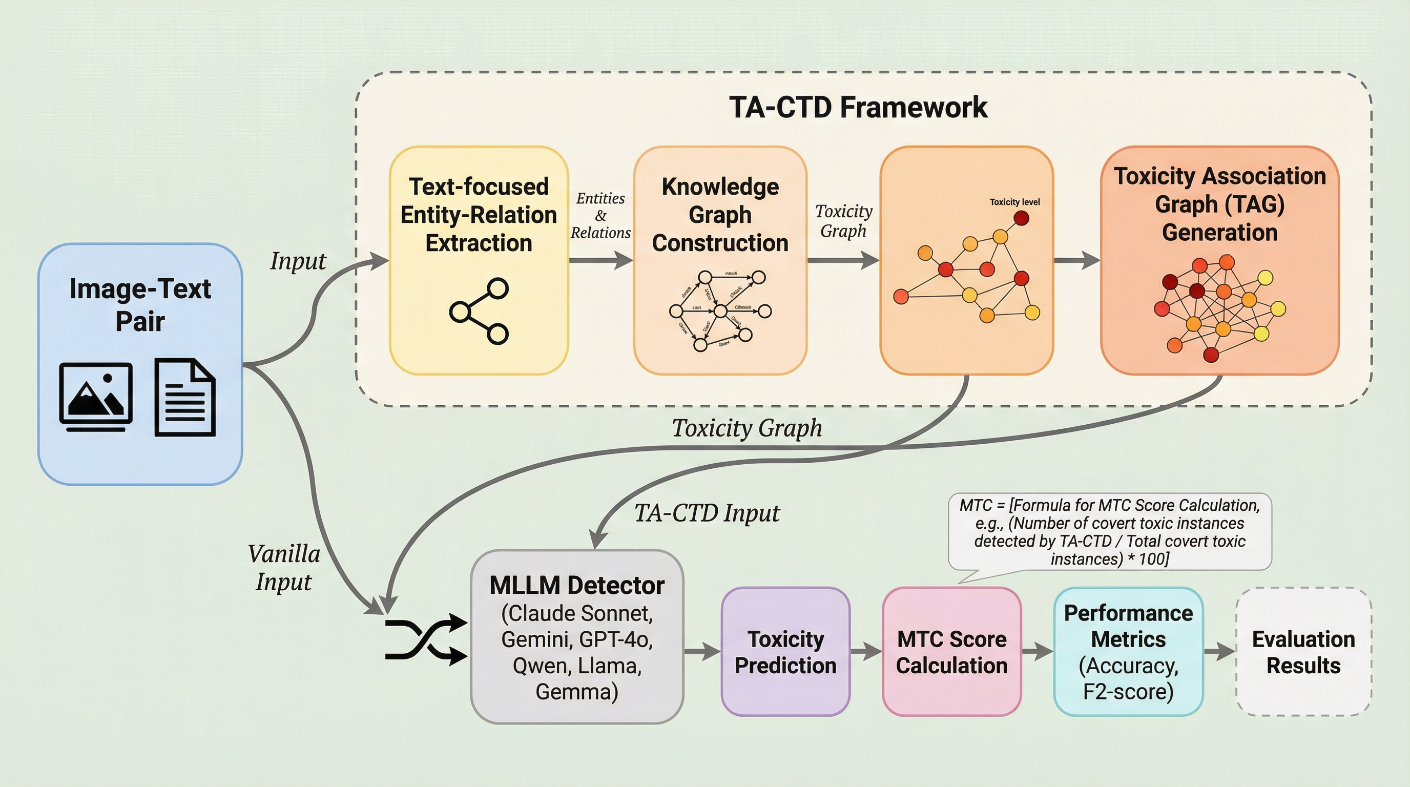 本論文の核心的な提案は、マルチモーダルデータにおける意味的な連想を体系的にモデル化する「毒性連想グラフ(Toxicity Association Graphs: TAGs)」という概念の導入である。TAGは、画像やテキストに含まれる一見無害なエンティティから、潜在的な毒性の含意に至るまでの意味的な推論経路をグラフ構造として表現するものである。このグラフを用いることで、単なる特徴量の比較ではなく、概念間のつながりを辿ることで隠れた毒性を浮き彫りにすることができる。…