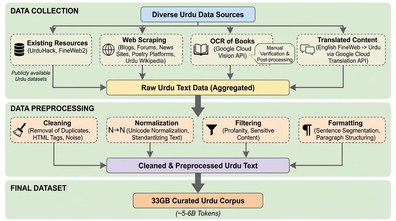 ウルドゥー語は世界で2億3000万人の話者を抱える主要言語ですが、既存の多言語モデルではトークン化の非効率性や文化的な不正確さが課題となっており、専用の生成モデルや高品質なデータセットが不足していました。
