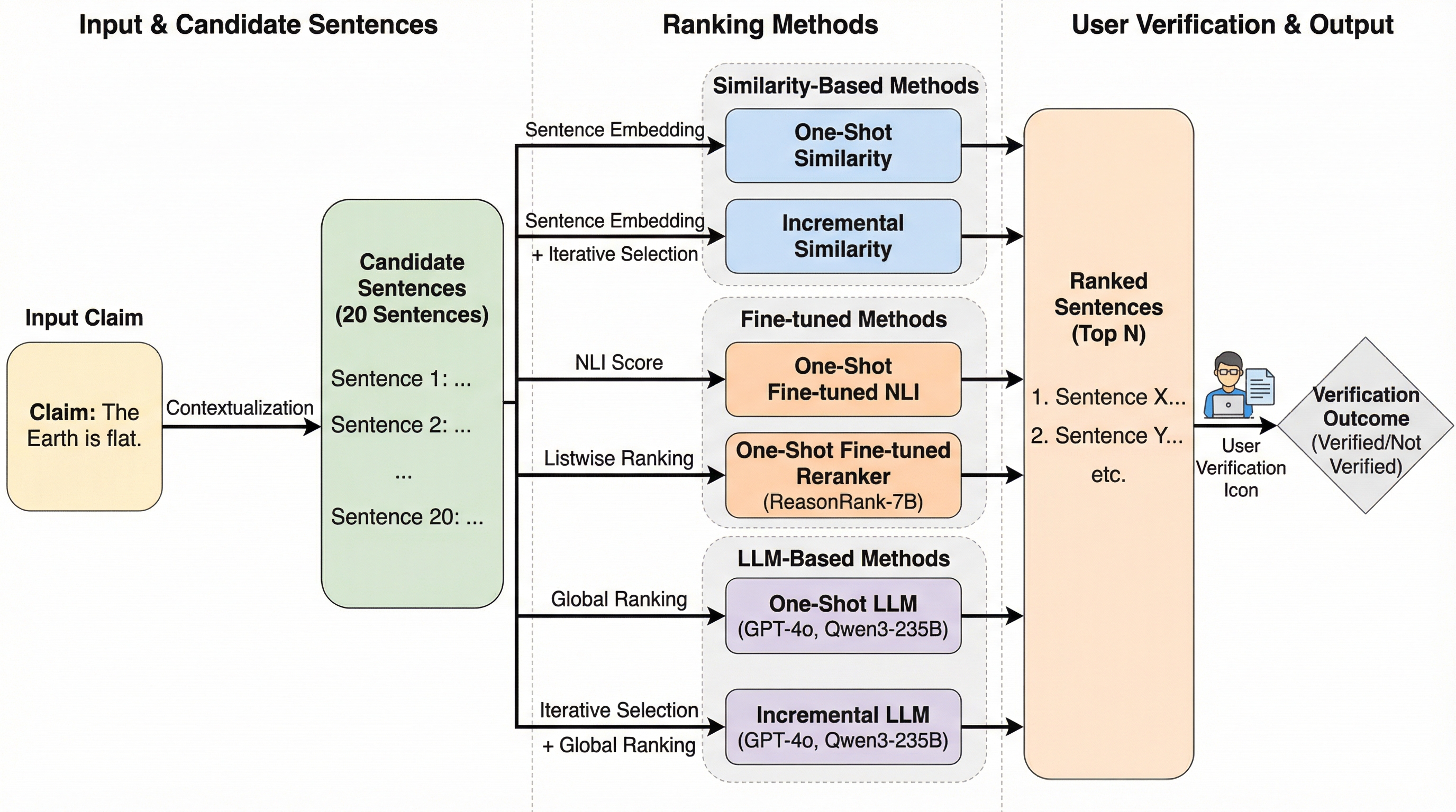 本研究では、従来のバイナリな証拠選択(選ぶか選ばないか)という枠組みを、ユーザーの行動に即した「証拠ランキング」という新しいタスクへと再定義しました。このタスクの目的は、候補となるすべての証拠文に順位を付け、主張の検証に十分な情報のセット(最小十分セット)ができるだけ上位に現れるようにすることです。…