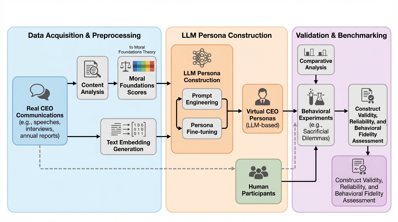 本研究は、製薬およびバイオテクノロジー業界のCEO181名の公開データ(年次報告書、インタビュー、ニュース記事)と道徳基盤理論(MFT)を組み合わせ、大規模言語モデル(LLM)を用いて実在の経営者を模した仮想ペルソナを構築する手法を提案した。