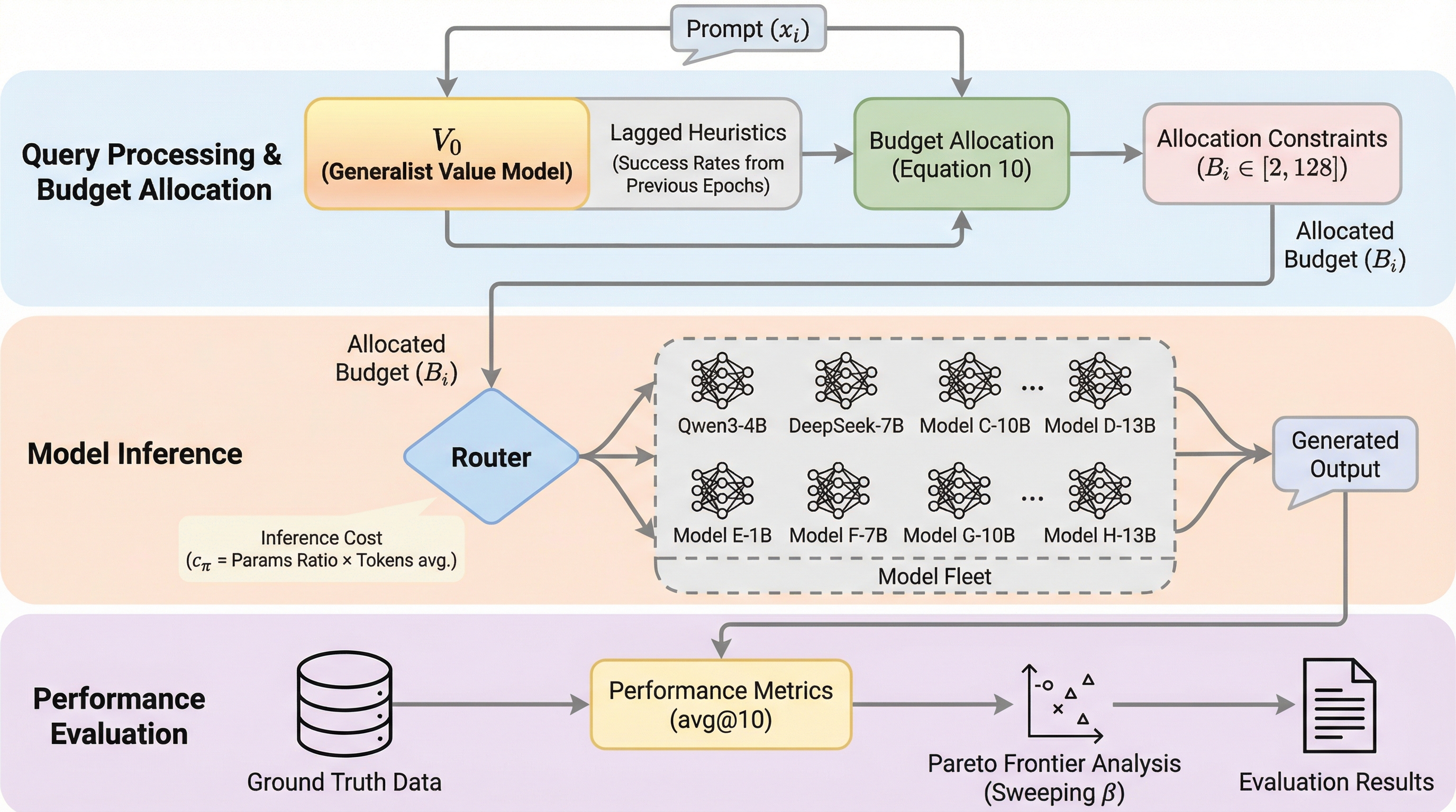 本論文では、価値推定の枠組みを根本的に再定義した汎用価値モデル「V0」を提案しています。V0の核心的なアイデアは、方策の能力を価値モデルのパラメータ内に隠れた潜在変数として扱うのではなく、明示的な「文脈入力(コンテキスト)」として扱うことにあります。具体的には、価値推定を従来の「パラメータのフィッティング」から「インコンテキスト学習(ICL)」へと転換しました。V0は、特定のモデルが過去にどのようなクエリに対してどのようなパフォーマンス(成功または失敗)を示したかという履歴ペアをコンテキストとして受け取り、それに基づいて未知のプロンプトに対する期待性能を予測します。…