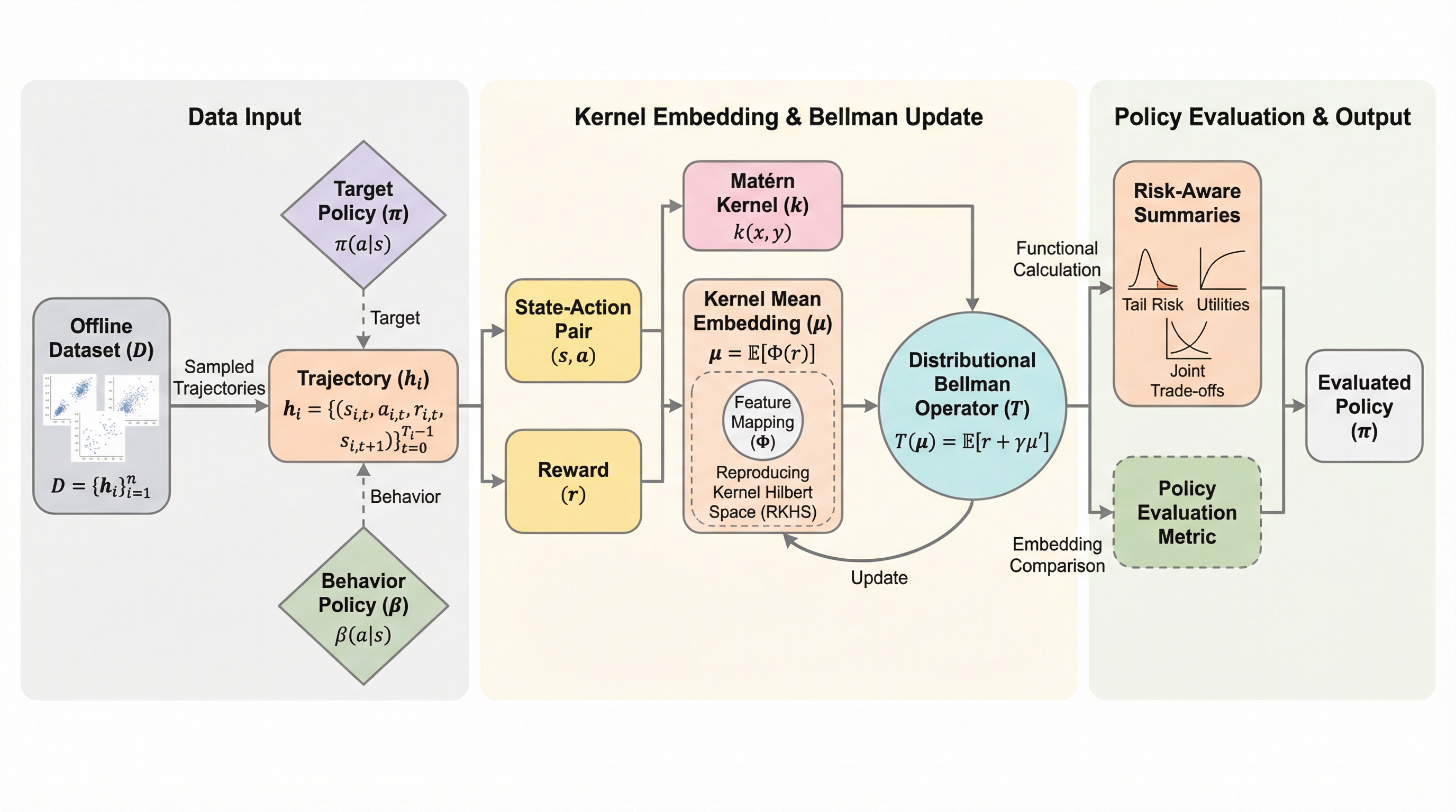 本研究は、多次元の報酬指標と連続的な状態行動空間を扱うオフライン強化学習において、将来的なリターン分布を精度高く推定する新フレームワーク「KE-DRL」を提案している。 従来の分布型強化学習で主流だったワッサースタイン距離は、高次元空間での計算コスト増大と統計的不安定性が課題であったが、再生核ヒルベルト空間への埋め込みとマテルン核を用いた積分確率指標を導入することで、この問題を理論的かつ計算的に解決した。 数学的な解析により分布型ベルマン作用素の縮小性と一様収束性を証明するとともに、エクスペディアのホテル検索データを用いた実証実験を通じて、テールリスクの評価や複数報酬間の複雑なトレードオフを考慮した意思決定における実用的な有効性を明らかにした。