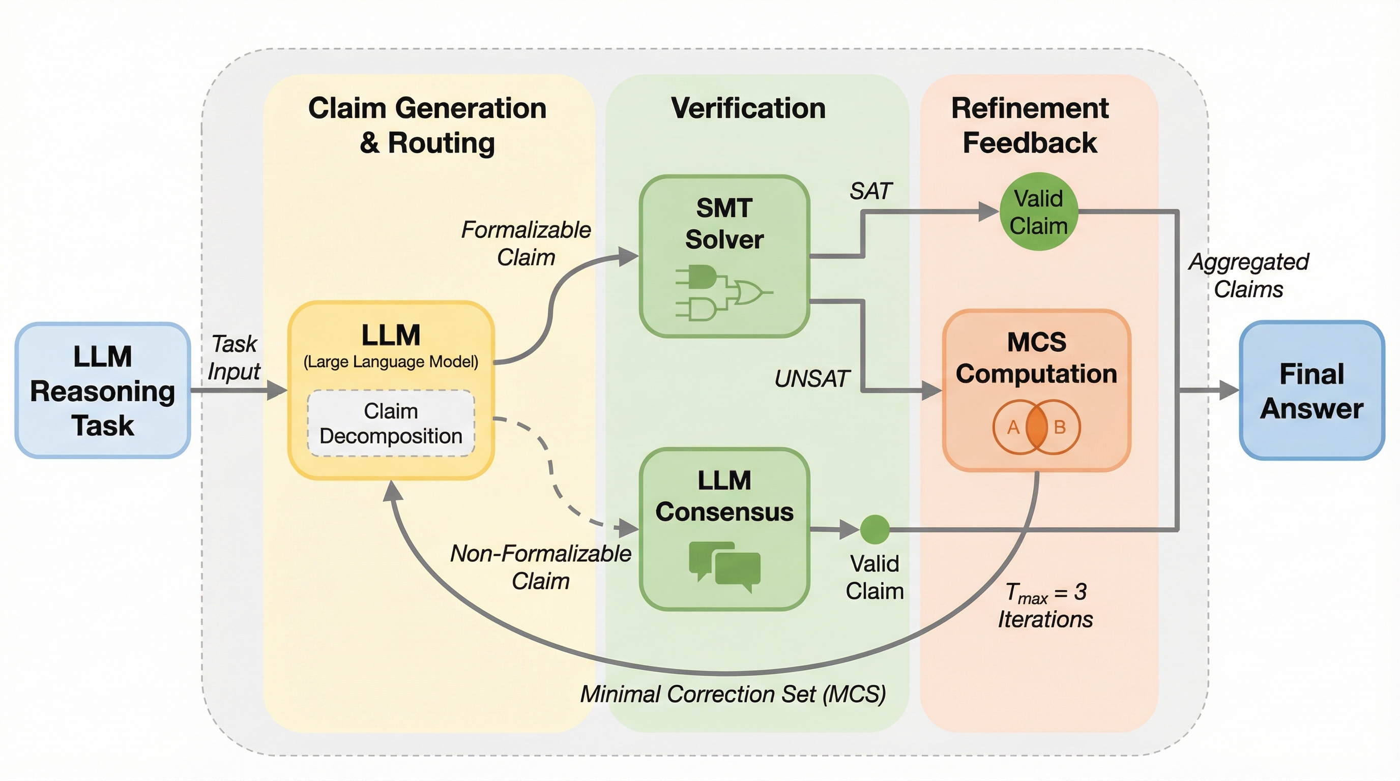大規模言語モデル(LLM)の論理的正確性を保証するため、LLMとSMTソルバーを統合し、反復的な洗練を通じて検証済みの回答を生成する神経記号的フレームワーク「VERGE」が提案されました。 このシステムは、出力を原子的な主張に分解し、論理的な内容は記号ソルバーで、常識的な内容はLLMアンサンブルで検証するセマンティックルーティングと、最小修正サブセット(MCS)によるエラー箇所の特定を導入しています。 検証の結果、GPT-OSS-120Bモデルにおいて、従来のシングルパス手法と比較して平均18.7%の性能向上が確認され、特に法的な推論や複雑な論理問題において、形式的な検証がハルシネーションの抑制に大きく寄与することが示されました。