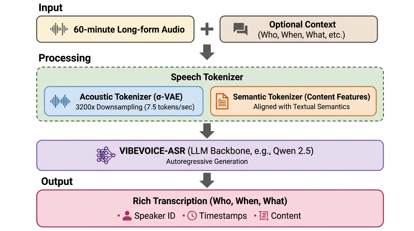 VIBEVOICE-ASRは、会議やポッドキャストなどの最長60分に及ぶ長尺音声を、分割せずに一度のパスで処理可能な汎用音声理解フレームワークであり、従来の手法で課題となっていた文脈の断片化や複数話者の複雑性を解消することに成功しています。 このシステムは、音声認識(ASR)、話者識別(Diarization)、タイムスタンプ付与を「Rich Transcription」という単一の生成タスクとして統合し、50以上の言語に対応するとともに、ユーザーが提供するプロンプトに基づいたドメイン固有の用語認識精度の向上を実現しています。 公開ベンチマークを用いた検証では、Gemini-2.5-ProやGemini-3-Proといった強力なマルチモーダル基盤モデルを、話者識別の正確性(DER)や時間制約付きの認識精度(tcpWER)において一貫して上回る性能を示し、長尺音声理解における新たな基準を確立しました。