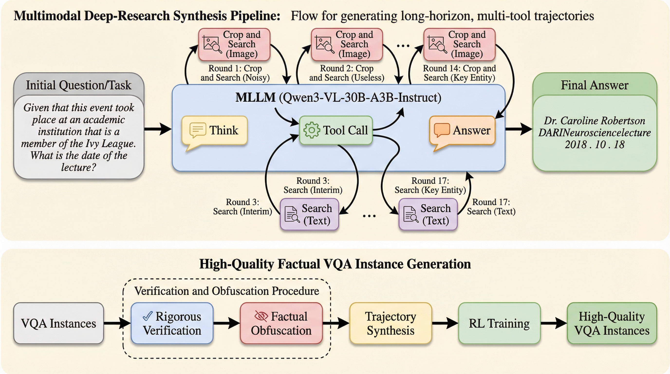 本研究では、現実世界のノイズが激しい検索エンジンに対しても頑健に情報を取得できる新しいマルチモーダル深層調査パラダイム「Vision-DeepResearch」を提案しました。この手法の核心は、単発の検索ではなく、マルチターン、マルチエンティティ、そしてマルチスケールでの視覚およびテキスト検索を実行することにあります。具体的には、数十段階の推論ステップと数百回に及ぶエンジンとの対話をサポートし、複雑な事実確認を自律的に行う能力をMLLMに持たせています。…