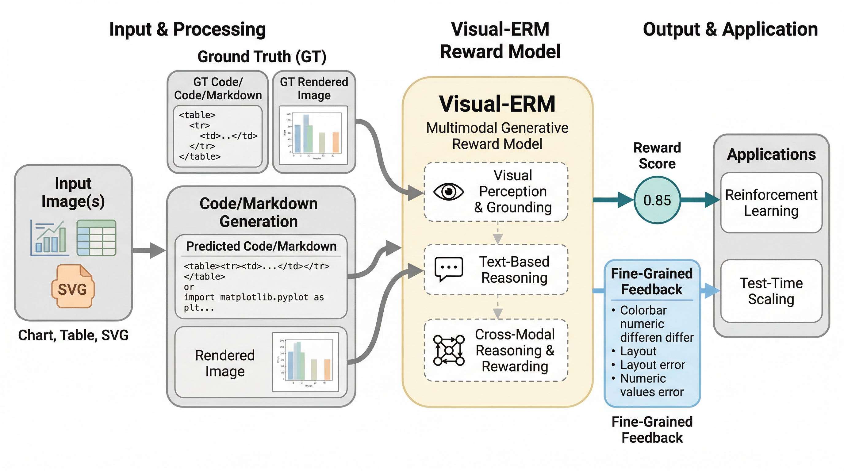 提案の中心は Visual Equivalence Reward Model、略して Visual-ERM です。これは vision-to-code 出力をそのままテキストで採点するのではなく、一度レンダリングして元画像と比較し、視覚的な等価性を報酬として返す multimodal generative reward model です。単なる一発スコアではなく、どこがどう違うのかを細かく説明できる、解釈可能な報酬になっている点が特徴です。