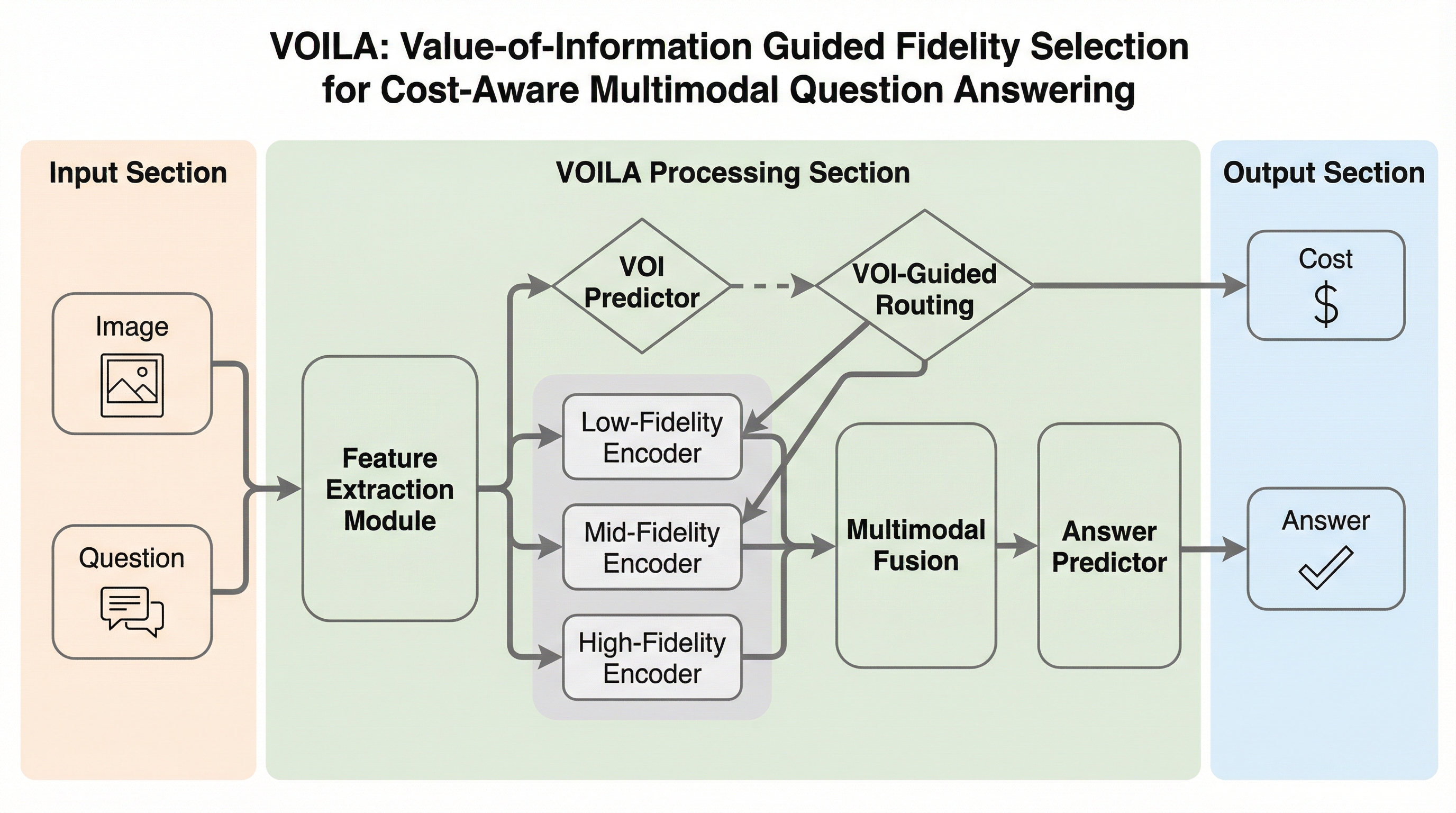 VOILAは、マルチモーダルな質問応答において、画像データを取得する前に最適な解像度(忠実度)を動的に選択する革新的なフレームワークである。質問文のテキスト特徴のみから各忠実度での正解確率を予測し、情報の取得コストと期待される精度のバランスを最大化する最小コストの忠実度を決定する。5つの主要データセットと最大235Bパラメータのモデルを用いた広範な検証により、フル解像度と同等の精度を維持しつつ、通信や計算のコストを50〜60%削減できることを実証した。