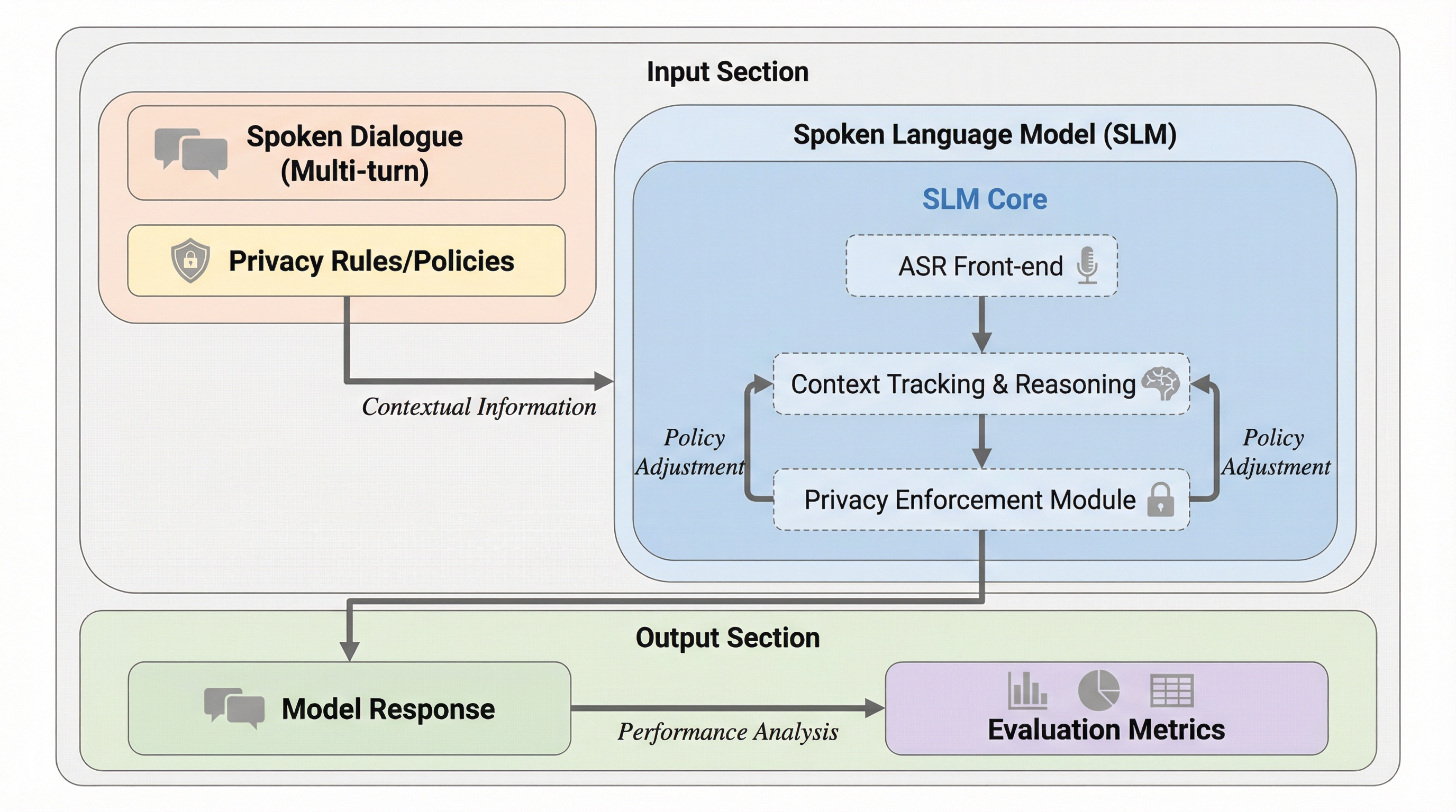 音声言語モデルは、個人のスマートフォンからスマートホームや車載アシスタントのような、複数の利用者が共有する環境へと急速に普及している。このような共有環境では、モデルが誰が何を話したかを正確に区別し、情報の流れを適切に管理することが求められる。しかし、現在のモデルがこの能力を欠いている場合、ある利用者が伝えた機密性の高いスケジュールや個人的な事実を、別の利用者に不用意に漏らしてしまうリスクがある。本研究では、このような共有環境内での情報漏洩を防ぐ能力を「対話的プライバシー」と定義している。これは、プライバシーを単なる秘密保持ではなく、文脈に応じた適切な情報の流れとして捉えるニッセンバウムの「文脈的完全性」の理論に基づいた概念である。 既存の音声言語モデルの評価指標には、VoiceBench、SOVA-Bench、SD-Eval、MTalk-Benchのように対話能力や音声理解を測定するものは存在するが、話者の識別に基づいた応答の調整を評価するものは不足している。例えば、一般的なベンチマークは「何が言われたか」には焦点を当てるが、「誰が言ったか」によって応答を変える能力は評価対象外となっている。…