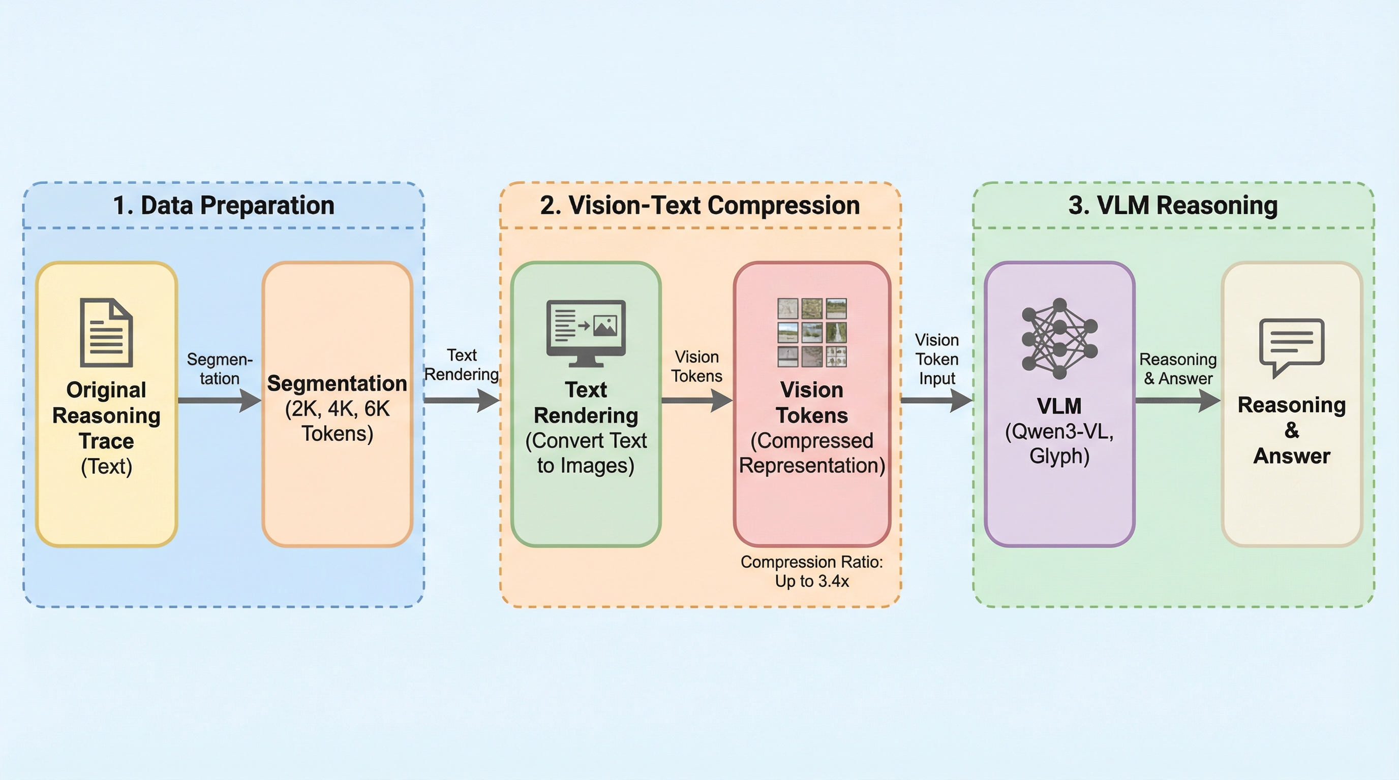 VTC-R1は、大規模言語モデルの長文脈推論における計算コスト増大を解決するため、中間的な推論過程を画像化して圧縮する新しい効率化パラダイムである。従来のテキストベースの処理に代わり、推論ステップを軽量なレンダリングによってコンパクトな画像へと変換し、それを「光学メモリ」として視覚言語モデルに繰り返し入力することで、詳細な情報を保持したままトークン数を大幅に削減する。数学的推論ベンチマークにおいて、標準的な手法を凌駕する精度を達成しつつ、エンドツーエンドの遅延を最大2.7倍高速化し、テキストトークンを約3.4倍の効率で圧縮することに成功した。この手法は追加の学習段階や外部の強力なモデルを必要とせず、モデルフリーで軽量な設計となっており、複雑な推論タスクにおける実用的なスケーラビリティを提供する。