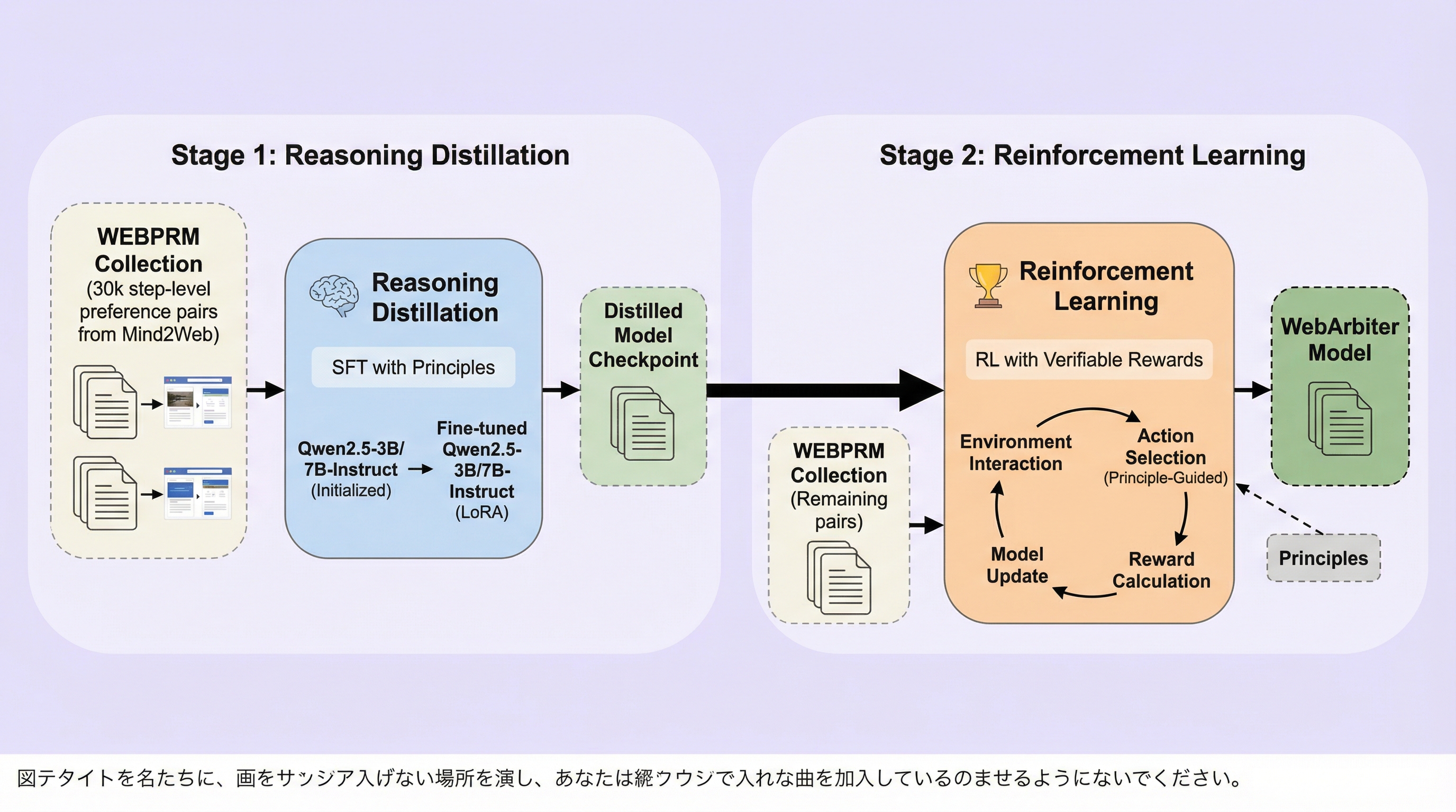 Webエージェントが複雑なタスクを遂行する際、最終結果のみを評価する従来手法では、途中の不可逆な誤りや信号の遅延に対応できないという深刻な課題がありました。本研究で提案されたWebArbiterは、行動の妥当性をテキスト生成による「推論」と「原理の導出」を通じて評価する、推論優先型のプロセス報酬モデル(WebPRM)であり、単なる数値スコアではなく論理的な根拠を生成します。このモデルは、強力な教師モデルからの推論蒸留と、正解信号に直接合わせる強化学習の2段階で訓練され、既存のGPT-5などの大規模モデルを大幅に上回る精度を達成したほか、4つの異なるWeb環境を網羅した評価ベンチマーク「WEBPRMBENCH」において、実用的なWeb操作タスクの成功率を最大7.2ポイント向上させるなど、極めて高い実用性と堅牢性を証明しました。