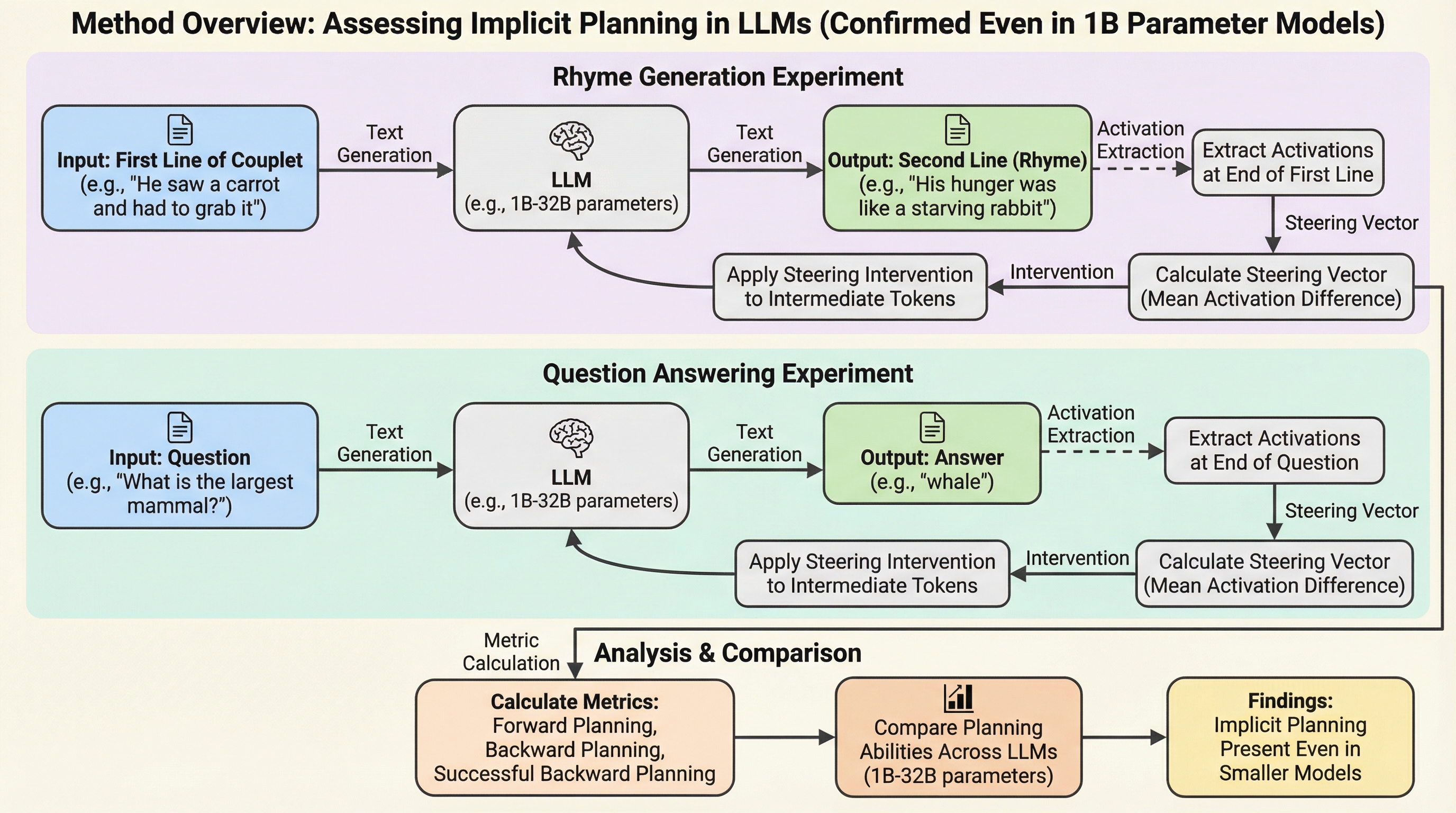 大規模言語モデルは、単に次の単語を予測するだけでなく、将来出力すべき内容を事前に準備する「暗黙的計画」の能力を備えていることが明らかになりました。 本研究では、モデルの内部状態を操作する簡便な手法を用いることで、10億パラメータ程度の比較的小規模なモデルにおいても、この計画能力が普遍的に存在することを定量的に実証しました。 この手法により、特定の韻を踏む際や質問に回答する際に、数トークン手前の段階で冠詞や中間表現を動的に調整しているメカニズムが解明され、AIの安全性と制御の理解に新たな道を開きました。