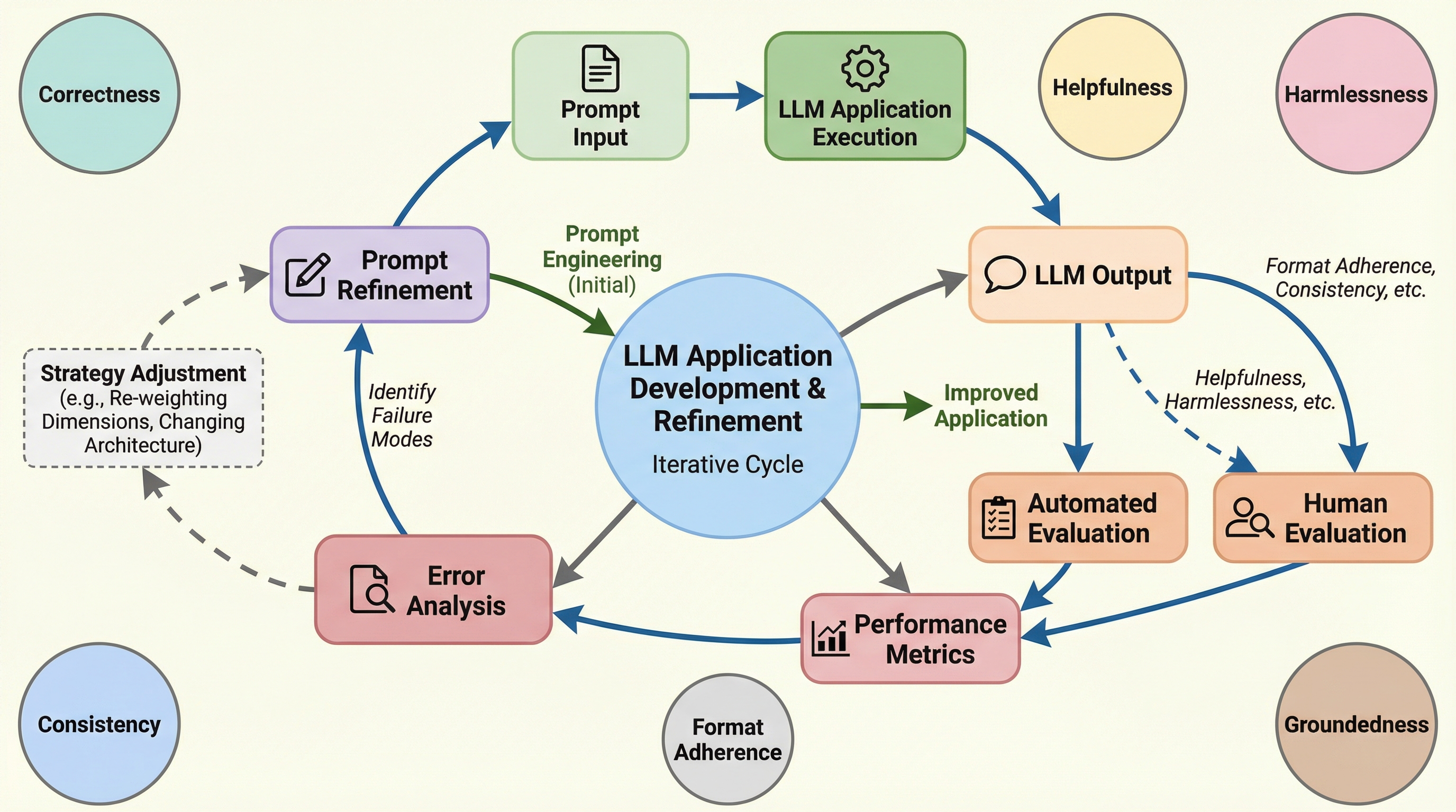 LLMの出力は非決定論的でモデル更新に敏感なため、従来の決定論的なテスト手法では不十分であり、「定義・テスト・診断・修正」の4フェーズからなる評価主導型の反復ワークフローを導入することで、場当たり的な調整から再現可能なエンジニアリングプロセスへの転換を提案する。