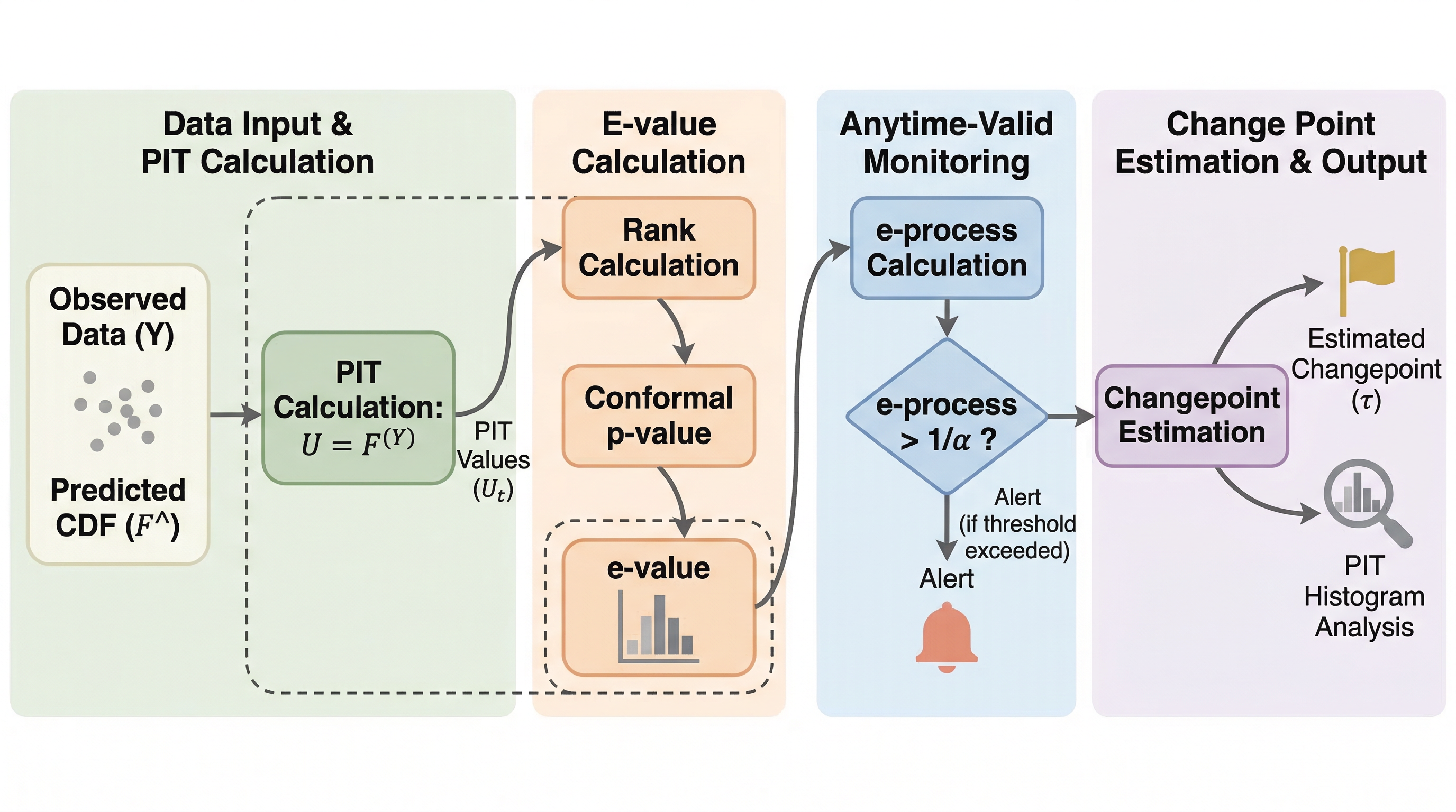 提案の中心は PITMonitor です。名前の通り、予測分布から得られる probability integral transform, すなわち PIT の分布が時間とともに変わったかを監視します。PIT は、予測CDFに実際の観測値を通したスカラー量で、モデルが完全に校正されていれば一様分布に従います。逆に、過信、過小分散、位置ずれ、尾部のズレなど、予測分布と現実のズレはすべて PIT 分布の歪みとして現れます。