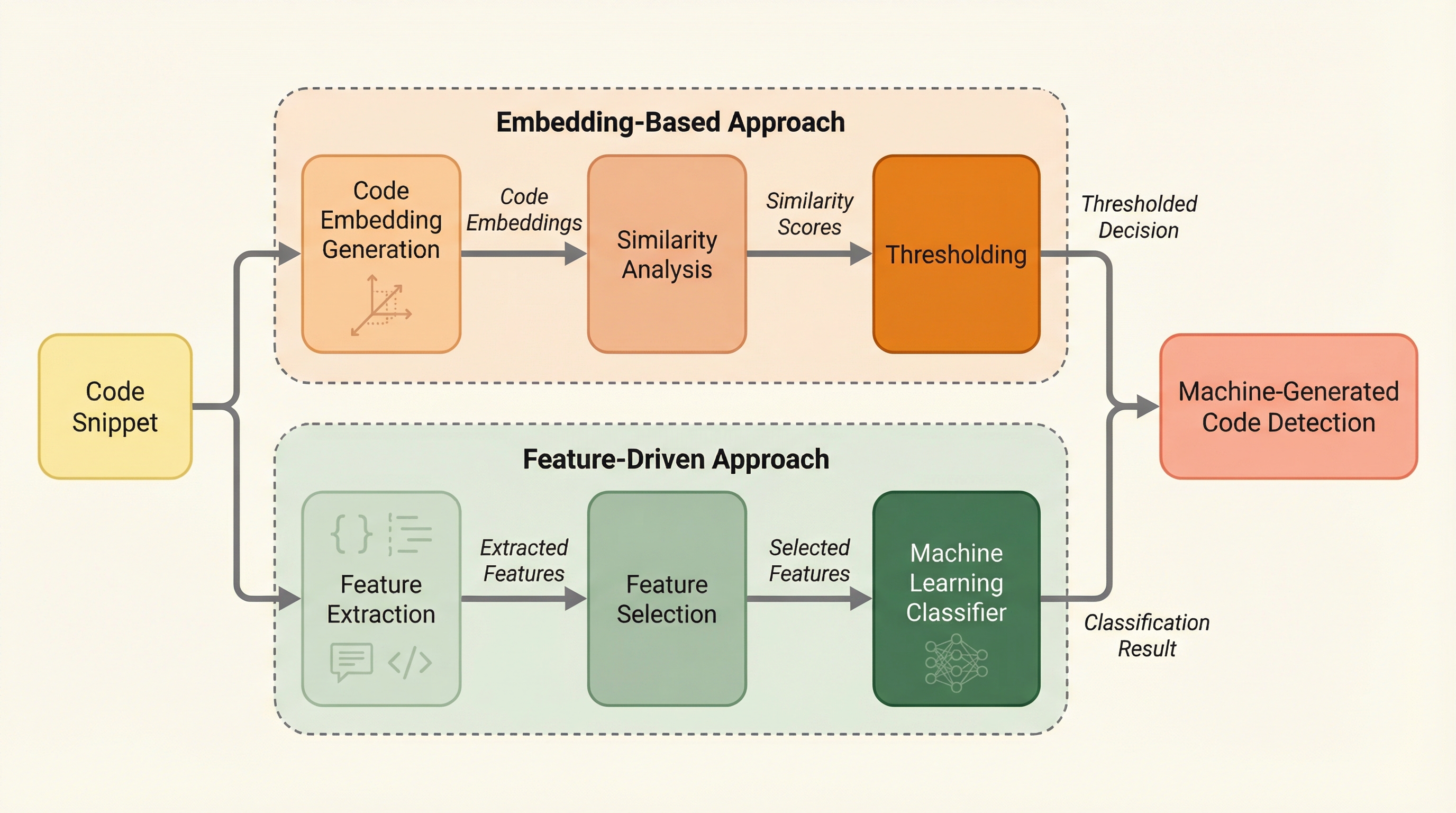 本研究では、人間が書いたコードと機械が生成したコードを区別するための体系的なアプローチとして、2つの相補的なパラダイムを比較するフレームワークを提案しました。1つ目は「特徴量ベースのアプローチ」であり、コードの表面的なスタイルや構造的特性を捉える手作業の指標を抽出します。これはコードスタイロメトリや著作者特定に関する従来の研究に根ざしたもので、高い解釈性と効率性を提供します。2つ目は「埋め込みベースのアプローチ」であり、CodeBERTのような事前学習済みのコード用言語モデルを使用してコードを密なベクトルに変換し、深い文脈的な規則性を利用します。 これらの2つのパイプラインを統一されたプロトコルの下で訓練および評価することで、それぞれの強みと限界を明らかにしました。特に、解釈可能性、汎用性、および計算コストに焦点を当てて比較を行っています。…