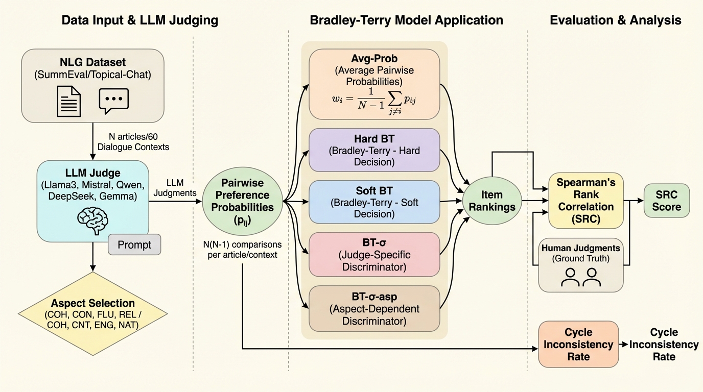 大規模言語モデル(LLM)を自然言語生成(NLG)の自動評価に使う場面が増えており、とくに候補を2つ並べて「どちらが良いか」を問うペア比較は、絶対スコアよりも安定しやすい枠組みとして広く用いられています。ところが、LLMを評価者(LLM-as-a-judge)として用いると、評価者が常に信頼できるとは限らず、タスクや観点によって性能や一貫性が大きく変わることがあります。さらに、LLMが返す「どちらが勝つ確率」は、自己選好バイアスや冗長性バイアス、プロンプトの言い回しや提示形式への感度などの影響を受けやすく、確率が偏ったり、論理的な整合性が崩れたりします。 実運用では、評価者を1つに固定するか、複数評価者の確率や投票を単純に平均することが多いですが、これは「全員が同程度に信頼できる」という仮定を暗に置いてしまいます。実際には、評価者の中にノイズの大きいモデルが混ざることがあり、平均との差分が埋もれてしまうと、集約結果が不安定になり得ます。また、人手ラベルを用意して評価者を校正する方法も考えられますが、参照なし評価では、人手ラベルがそもそも存在しない、あるいは十分に集められない状況が起こり得ます。…