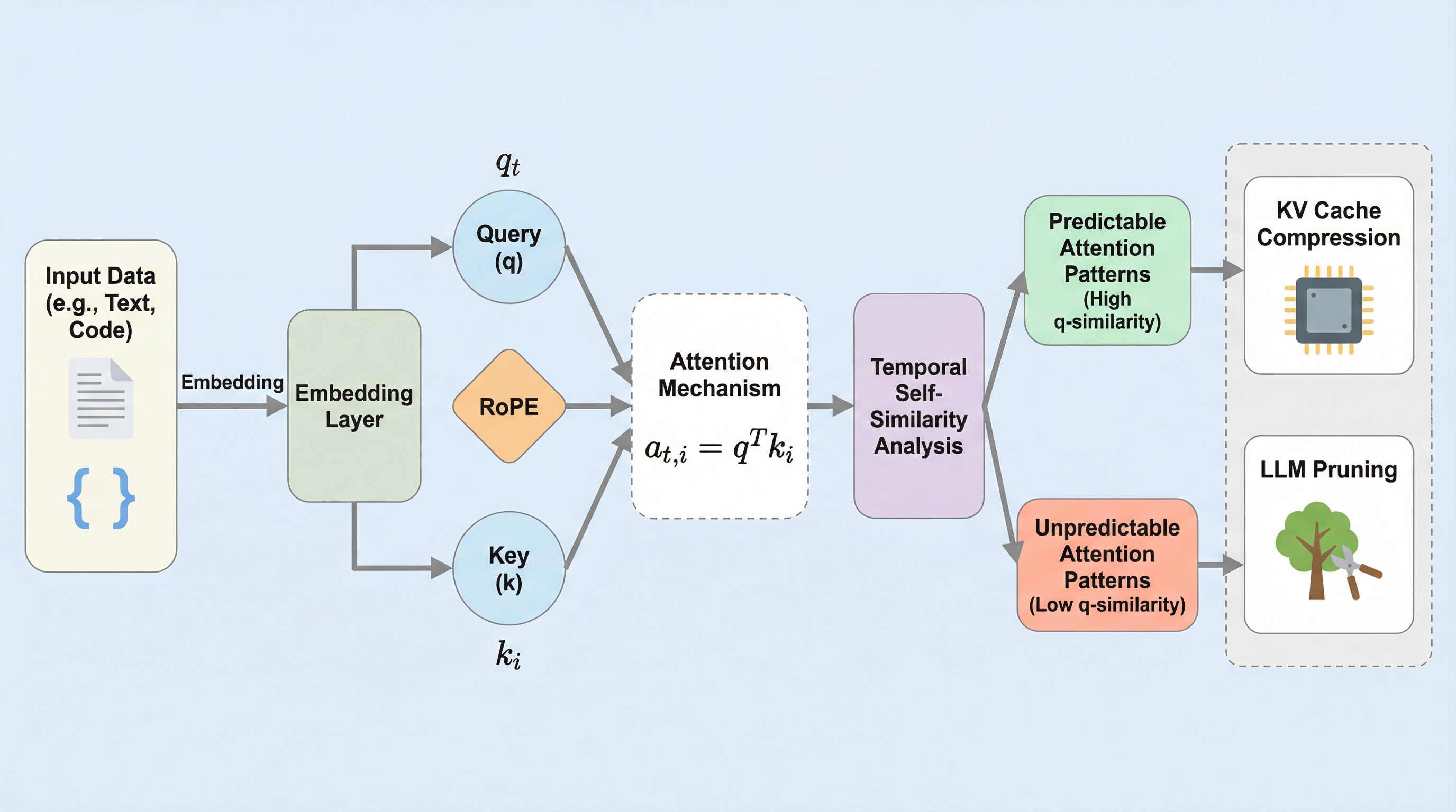 大規模言語モデル(LLM)のアテンションパターンを統一的に説明する理論的枠組み「TAPPA」を提案し、アテンションが予測可能(Predictable)なものと予測不能(Unpredictable)なものに分類されることを数学的に示した。アテンションの挙動を決定する主要な要因はクエリの自己類似性(q-similarity)であり、これが高い場合には垂直方向の再アクセス、対角線状のシーケンシャル、周期的なシーズナルといった構造的なパターンが形成される。この理論をKVキャッシュの圧縮やモデルの枝刈りに応用した結果、提案指標であるq-similarityを用いることで従来手法を上回る性能向上が確認され、推論の効率化とモデルの理解深化に寄与することが実証された。