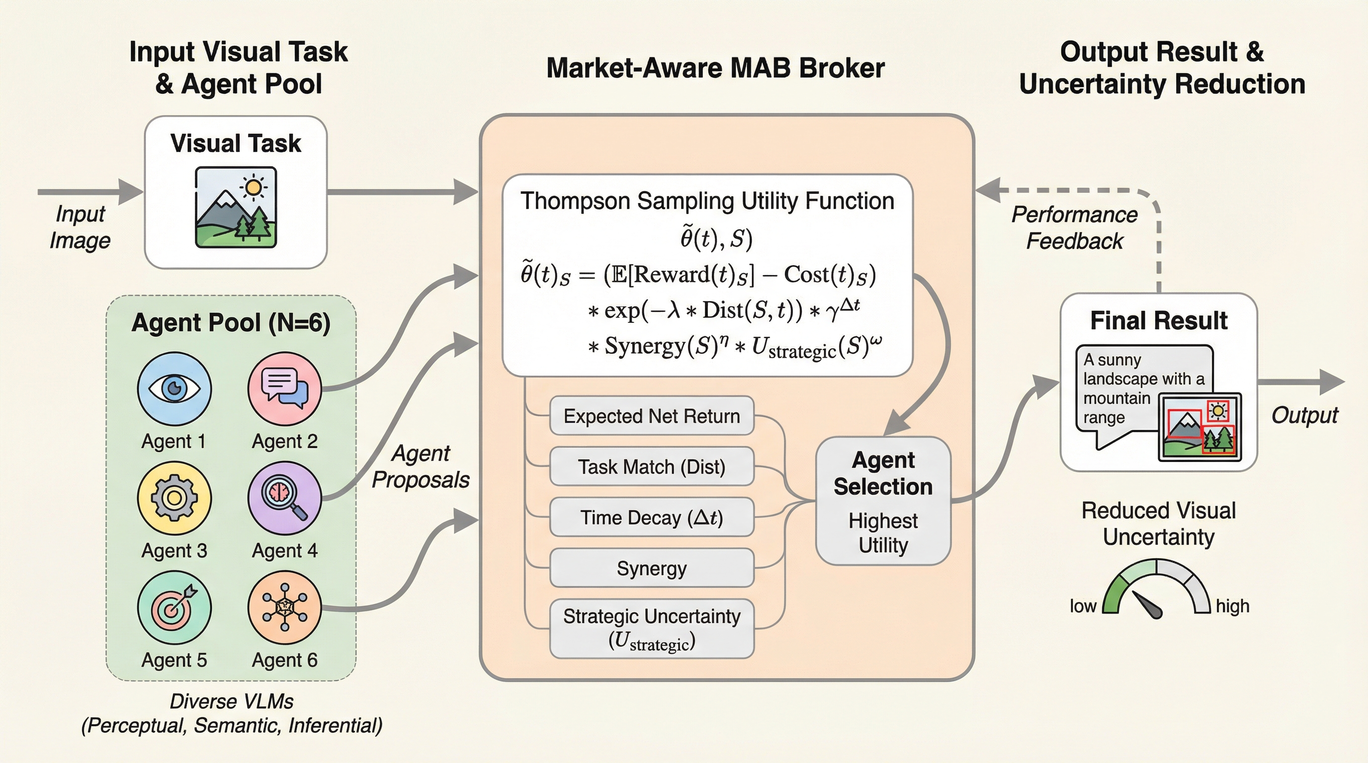 視覚言語モデル(VLM)を用いたマルチエージェントシステムにおいて、情報の非対称性と調整コストの増大という経済的課題を解決するため、不確実性を「取引可能な資産」と定義する分散型市場フレームワーク「Agora」が提案されました。