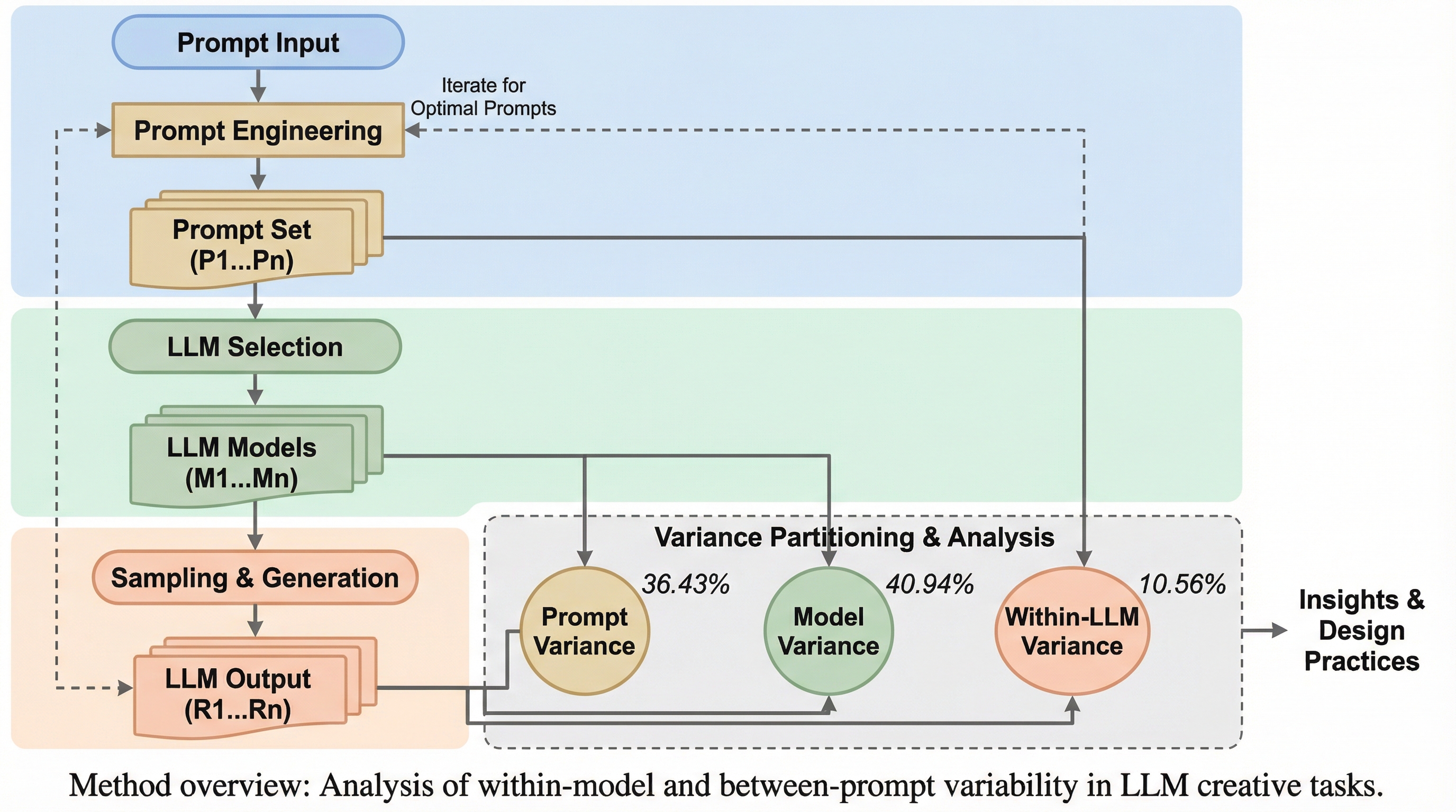 大規模言語モデル(LLM)の創造的出力における分散を詳細に分析した結果、出力の質である「独創性」についてはプロンプトが36.43%、モデルの選択が40.94%の影響力を持ち、両者が同等に重要であることが判明した。 一方で出力の量である「流暢性」については、モデルの選択が51.25%、モデル内部のサンプリングによる変動が33.70%を占めるのに対し、プロンプトの影響はわずか4.22%にとどまり、量はモデル固有の特性に強く依存している。 12種類のモデルと10種類のプロンプトを用いた12,000件のサンプル分析により、単一の試行による評価はサンプリングのノイズをプロンプトの効果と誤認するリスクがあるため、複数回の試行による評価の重要性が統計的に示された。