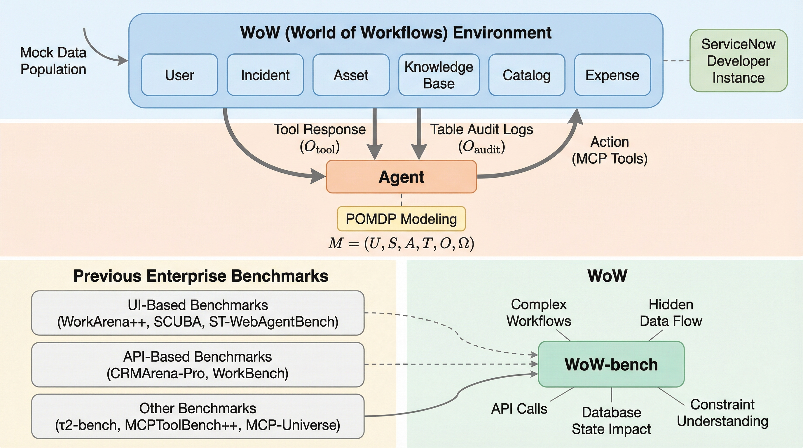 本研究では、企業システム特有の複雑な動態を評価するために、ServiceNowをベースとした現実的かつワークフロー中心の環境である「World of Workflows(WoW)」を導入した。この環境には、4,000以上のビジネスルールと55の有効なワークフローが組み込まれており、実際のIT運用におけるユーザー管理、インシデント対応、資産管理、ナレッジベース、カタログ、経費精算といった複数の管理ドメインを網羅している。これにより、単なるデータの読み書きだけでなく、システム内部で発生する複雑なロジックの連鎖を再現することが可能となった。…