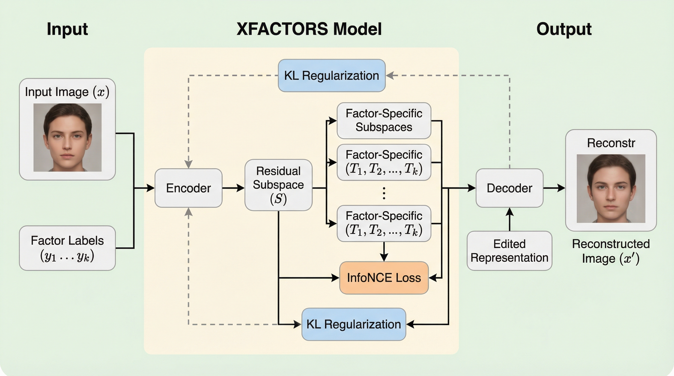 本論文では、XFACTORSと呼ばれる新しい弱教師あり学習フレームワークを提案している。この手法は、情報ボトルネック(Information Bottleneck)の観点に基づき、潜在空間を構造的に分割することで、特定の変動要素に対する明示的な制御を可能にする。具体的には、潜在空間 $Z$ を、関心のある各要素に対応する複数の部分空間 $T1, \dots, TK$ と、それ以外の情報を保持する残差部分空間 $S$ の直和として定義する。XFACTORSの最大の特徴は、敵対的学習や明示的な分類器を使用する代わりに、対照学習(Contrastive Learning)の目的関数であるInfoNCE損失を採用している点にある。…