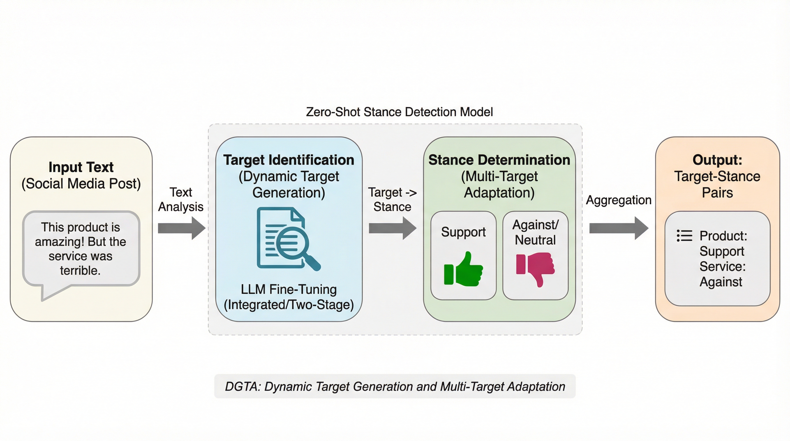 従来の立場検出はあらかじめ定義されたターゲットに依存していましたが、現実のソーシャルメディアではターゲットが動的で複雑であるため、未知のターゲットを自動特定し立場を判定する新タスク「DGTA」が提案されました。