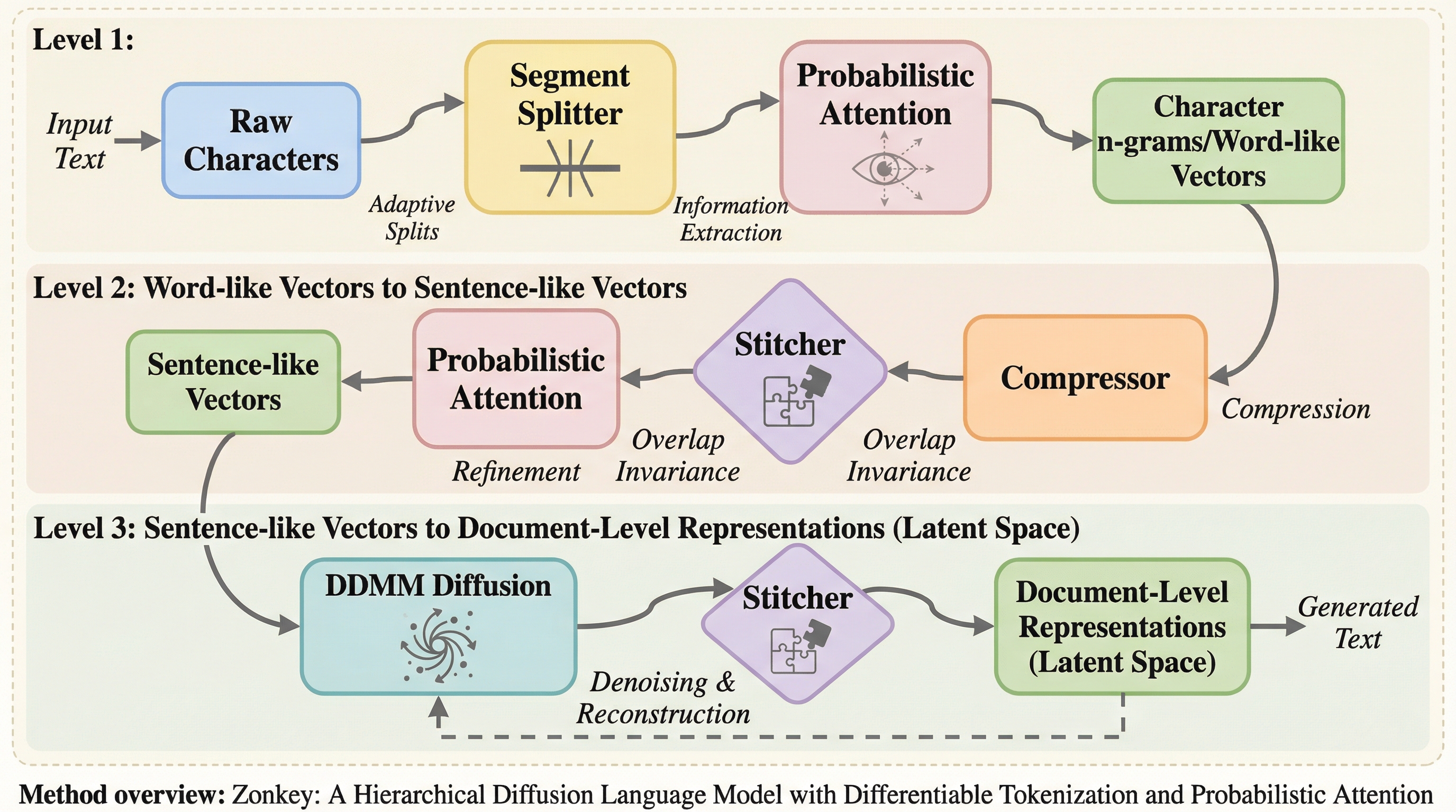 従来の言語モデルが抱えていた「固定された非微分的なトークナイザー」という制約を根本から解消するため、生の文字から文書レベルの表現までを完全に学習可能な階層型拡散モデル「Zonkey」が提案されました。
